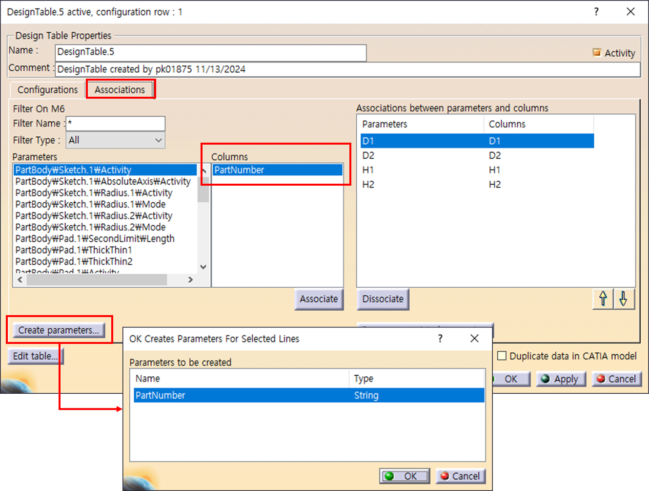 3. 아래의 화면에서 "Associations" 탭을 누르면, 자동으로 Columns란에 "PartNumber"가 추가되어 있다. 좌측하단에 "Create Parameter"를 클릭하면 저절로 String Type이 설정되고 OK를 클릭하면 Parameter가 생성된다.