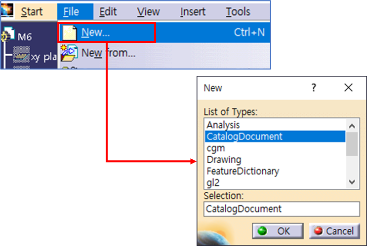 5. 상단 메뉴에서 "File - New"를 누르고 "CatalogDocument"를 선택 후 "OK"를 누르면, Catalog Editor 워크벤치로 이동된다.
