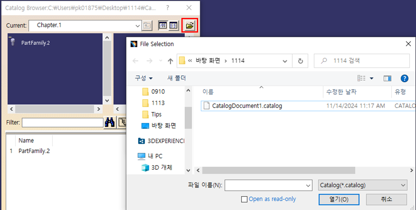 6. Chapter 툴바에서 "Add Part Family" 기능을 클릭하고 "Select Document"를 눌러서 Design Table이 포함된 CATPart 데이터를 선택 후 "열기"를 누르고 "OK"를 클릭한다.